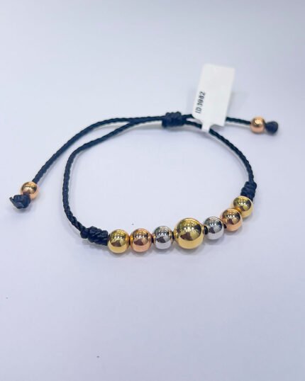 PULSO TEJIDO CON 9 BALINES DE TRES ORO 18K CON BOLA DE NEOPRENO EN HILO NEGRO