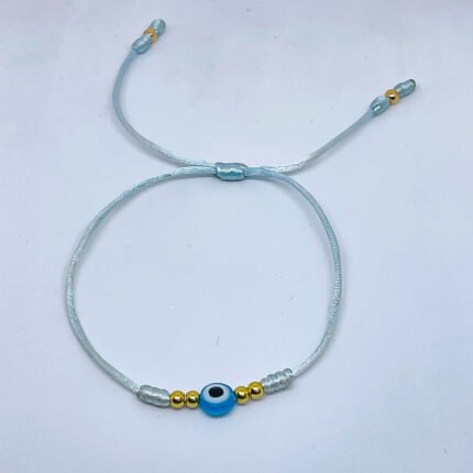 PULSO TEJIDO CON 6 BALINES DE ORO 18K CON OJO TURCO EN HILO COLOR AGUAMARINA
