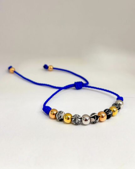 PULSO TEJIDO CON 8 BALINES DE ORO 18K CON BOLAS DE NEOPRENO EN HILO AZUL ELÉCTRICO