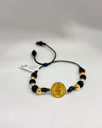 PULSO TEJIDO CON HERRAJE SAN BENITO Y 6 BALINES DE ORO 18K CON BOLAS DE NEOPRENO EN HILO NEGRO