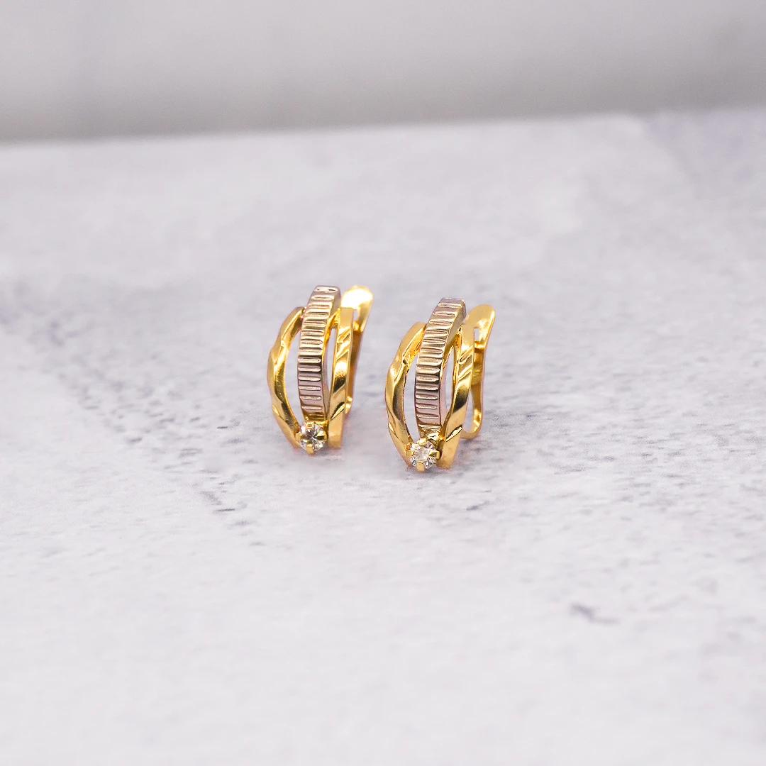 Aretes Cortos Calados Dos Oros con Piedra 18K elaborado en oro 18 Kilates, una joya exclusiva de Orofino, prestigiosa joyería en Ecuador especializada en anillos de oro, aretes de oro, cadenas y dijes de alta calidad. Su acabado pulido resalta la belleza natural del oro 18 Kilates, convirtiéndolos en aretes de oro ideales para realzar tu estilo con elegancia y sofisticación.