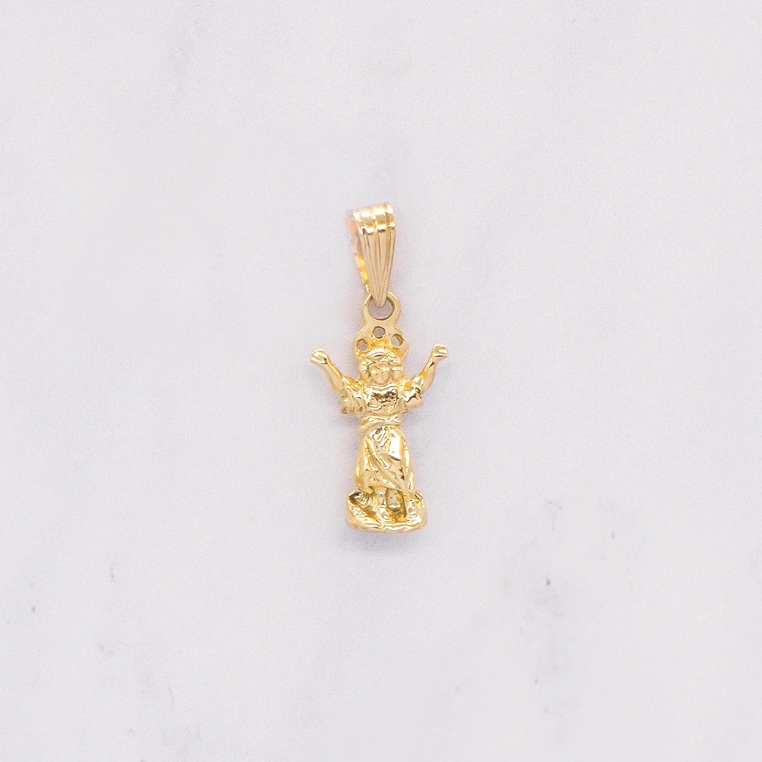 Dije Figura Divino Niño Oro 18K elaborado en oro 18 Kilates, una joya exclusiva de Orofino, prestigiosa joyería en Ecuador especializada en anillos de oro, aretes de oro, cadenas y dijes de alta calidad. Su diseño detallado y brillo radiante reflejan la excelencia de la joyería en Ecuador, siendo una opción perfecta para regalar o expresar tu fe y estilo personal.