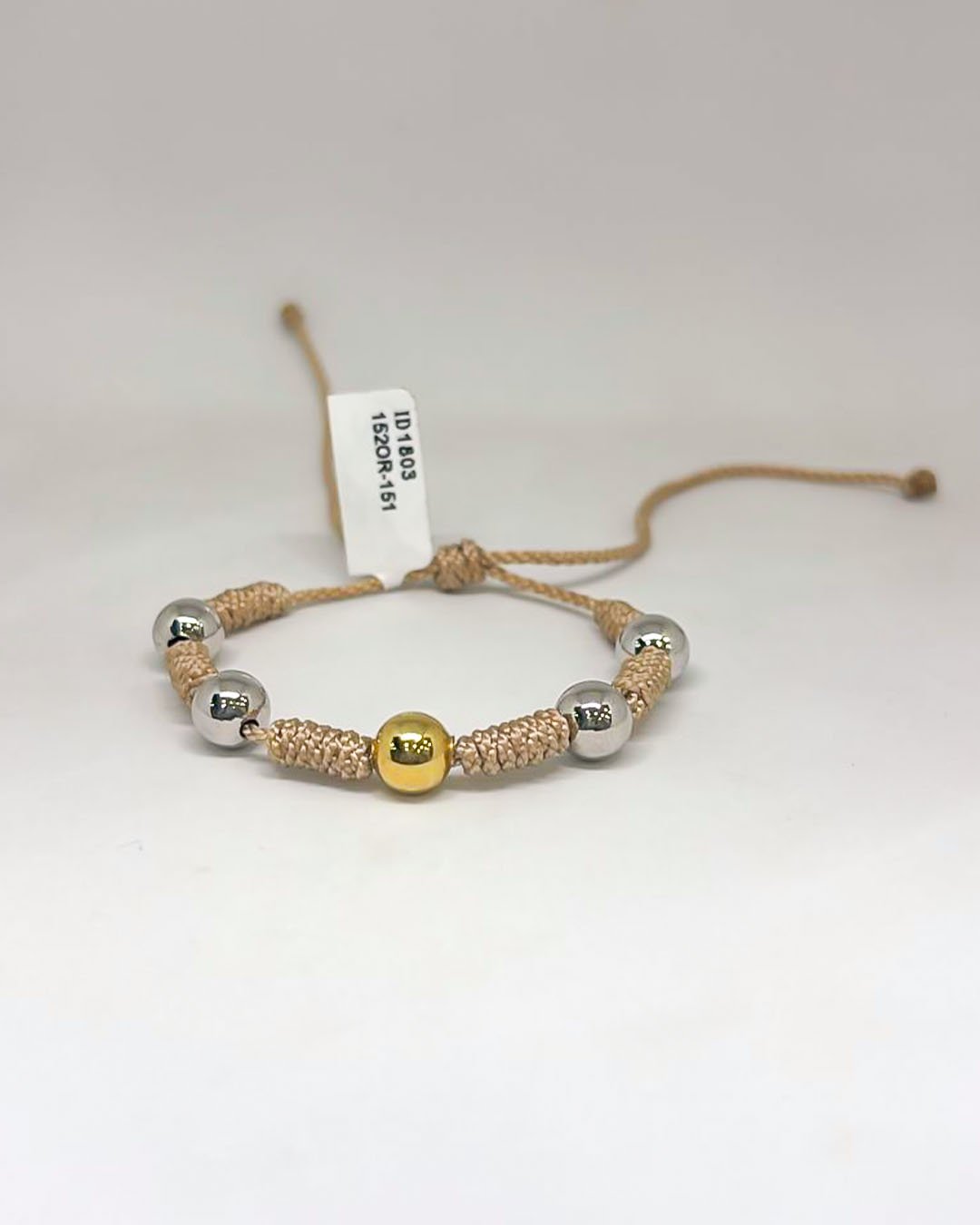 PULSO TEJIDO CON 5 BALINES EN ORO BLANCO Y AMARILLO 18K CON 6 NUDOS EN HILO BEIGE