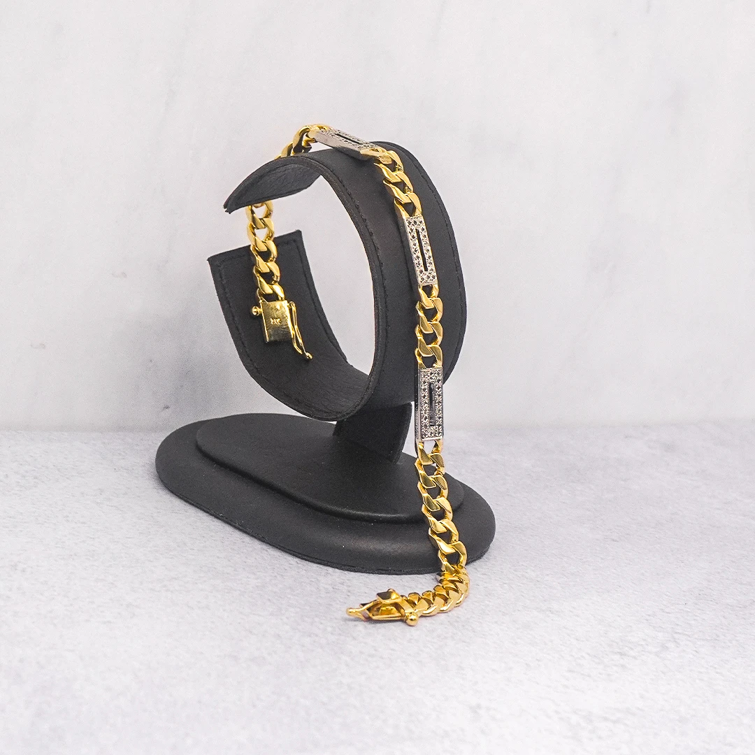 Pulso Tejido Cubano Barras Dos Oros con Piedras 18K elaborado en oro 18 Kilates, una joya exclusiva de Orofino, prestigiosa joyería en Ecuador especializada en anillos de oro, aretes de oro, cadenas y dijes de alta calidad. Su tejido cuidadosamente trabajado brinda durabilidad y brillo excepcional, perfecto para complementar anillos de oro y aretes de oro con un toque moderno y refinado.