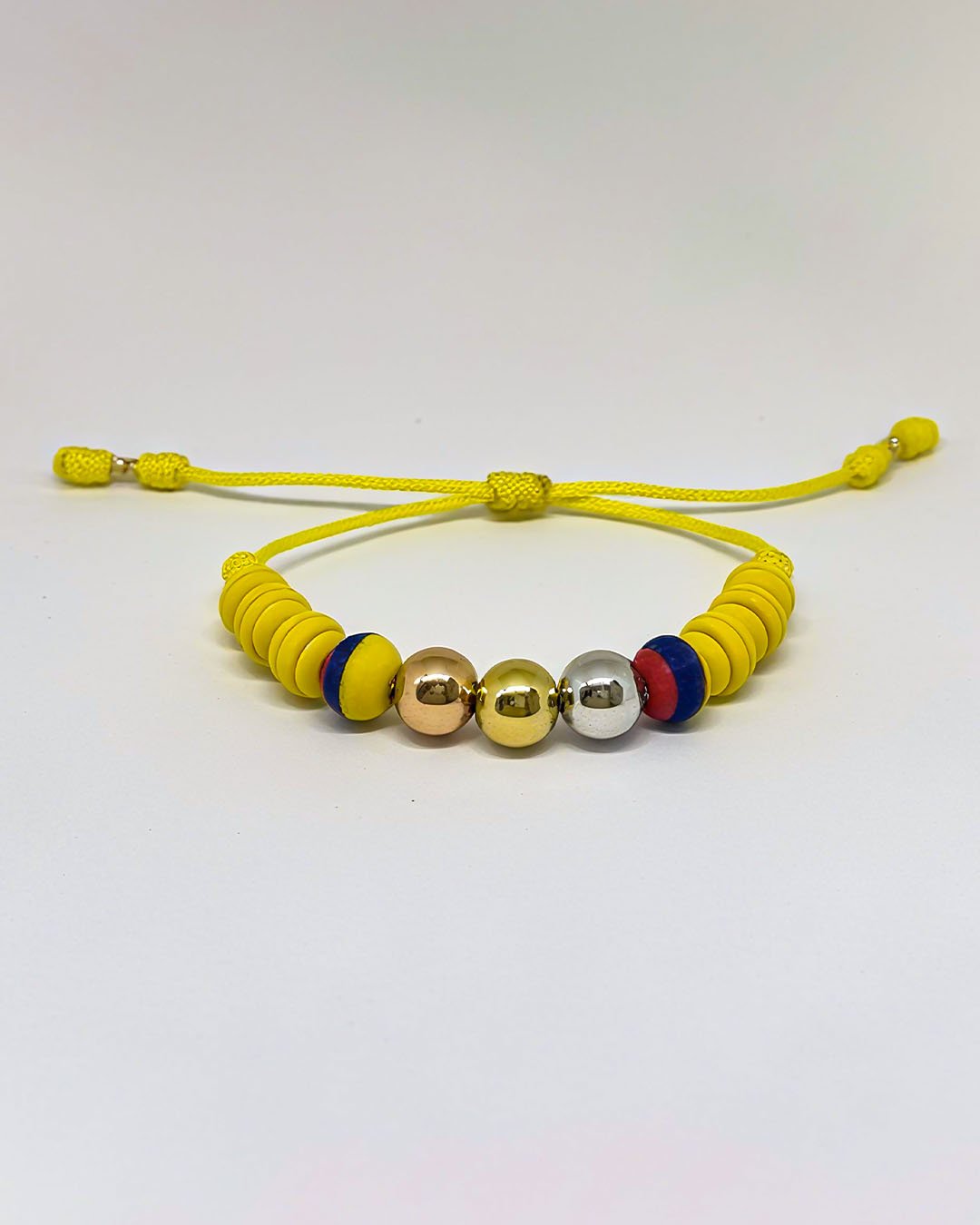 PULSO TEJIDO7 BALINES TRES ORO 18K CON BOLAS DE NEOPRENO EN HILO AMARILLO